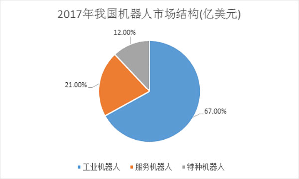 2017年我國(guó)機(jī)器人市場(chǎng)規(guī)模達(dá)到62.8億美元,2012-2017年的平均增長(zhǎng)率達(dá)到28%。其中,工業(yè)機(jī)器人42.2億美元,服務(wù)機(jī)器人13.2億美元,特種機(jī)器人7.4億美元。
