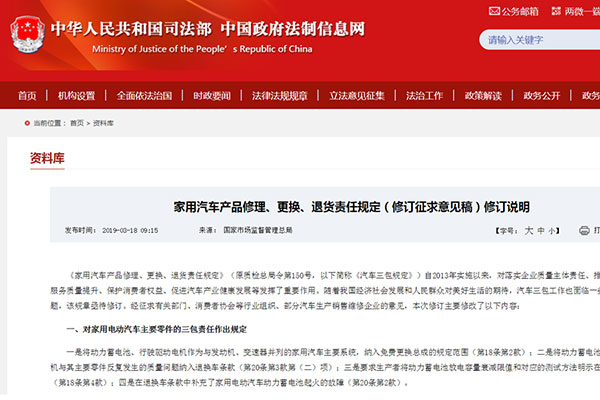 3月14日,國家市場監(jiān)督管理總局發(fā)布《家用汽車產(chǎn)品修理、更換、退貨責(zé)任規(guī)定》(修訂征求意見稿),意見稿將家用電動汽車的動力總成和主要零件納入汽車“三包”責(zé)任,特別是電池或電機(jī),如果發(fā)生嚴(yán)重質(zhì)量問題可退換車,譬如電池起火等。